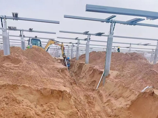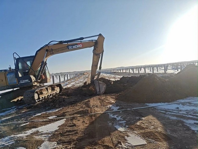 阻止2025年3月,,,履历了早期的场平、打混凝土桩基后,,,现在项目已进入要害攻坚阶段,,,55世纪新能源团队重点推进低压共沟开挖与配套建设、光伏组件装置质量及清静检查、 高压电缆整理进箱与集成线路盘留等阶段事情,,,以坚实推进项目早日乐成并网发电: